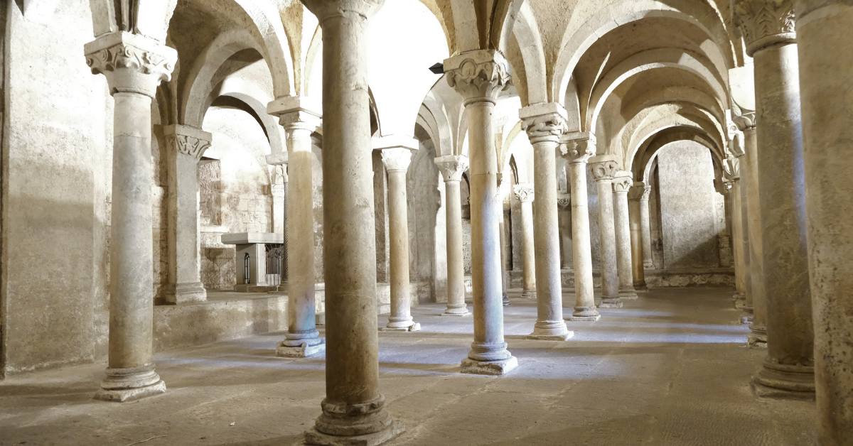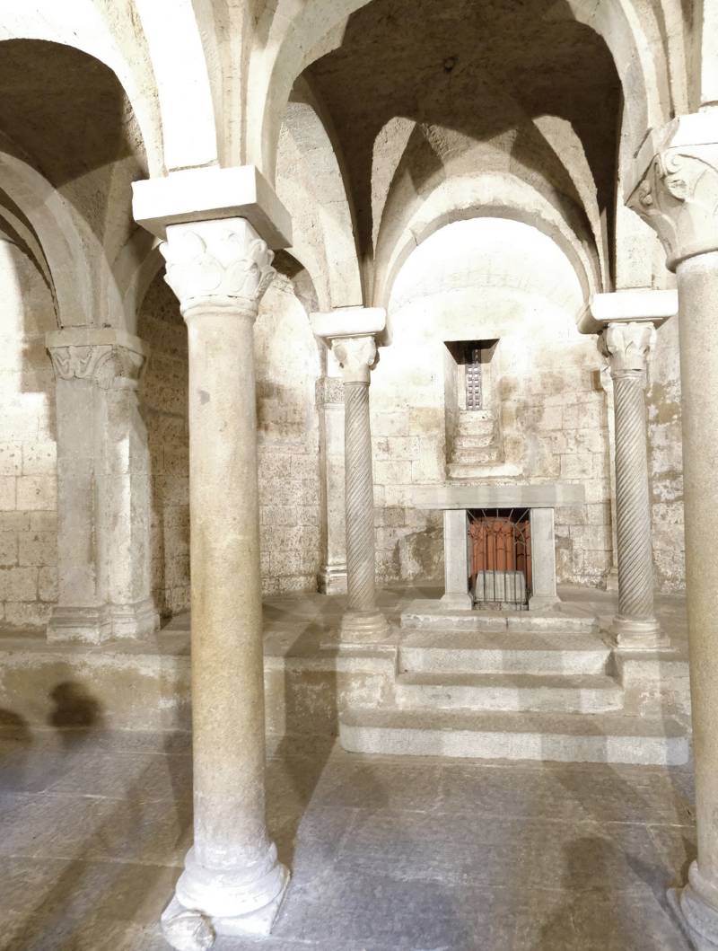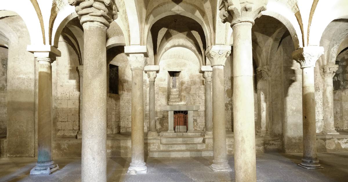 The crypt, with its rectangular floor plan and divided into nine small aisles by 24 columns, ends with three apses. The capitals, unique in their design and decorated with plant motifs, as well as human and fantastic figures, are a striking example of Romanesque style.