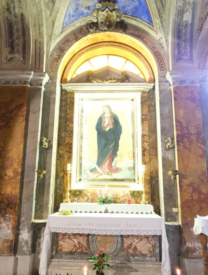 The fifth and final chapel is dedicated to the Most Blessed Sacrament, also known as the Madonna della Salute. Here, a painting from 1884, signed by C.F., depicts the Madonna surrounded by Saints Joseph and Camillus de Lellis, creating a place of deep spirituality and reflection. This chapel also preserves the memory of His Excellency Monsignor Giuseppe Gori, Bishop of Nepi and Sutri for 27 years, whose life, spanning from May 19, 1885, to July 2, 1969, is commemorated here in respect and veneration.