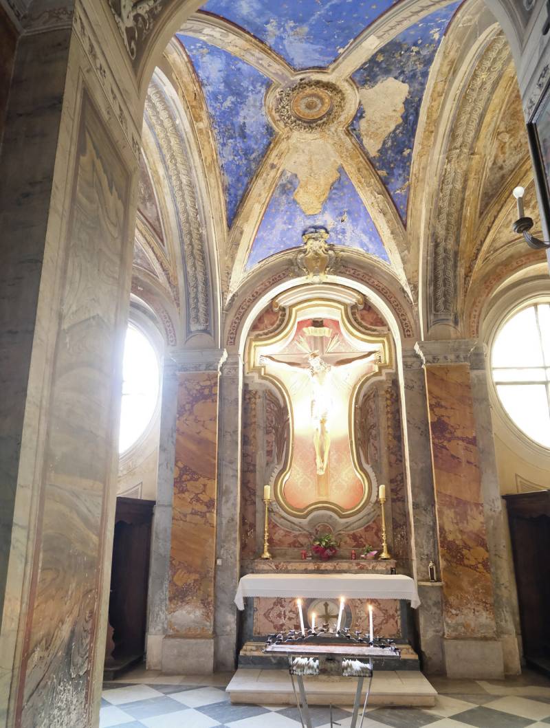 Accessible via the side stairs, the Presbytery reveals its full majesty, crowned by a false dome that plays with perspective, embracing within it sacred figures from the family of Mary of Nazareth – including Saints Anne, Joachim, Elizabeth, Joseph, Zachariah, Mary of Cleopas, and John the Baptist – as well as Old Testament prophets such as Isaiah, Moses, David, and Ezekiel, whose prophecies are deeply connected to the figure of the Virgin Mary. Among the decorations, two frescoes by Domenico Torti stand out, illustrating the martyrdom of the patron saints Saint Romano and Saint Ptolemy, and the imposing depiction of the Assumption of Mary into heaven, a masterpiece located in the apse area. Also significant are Torti’s signatures, one evidenced on the stone marking the decapitation of Saint Romano and the other on the harp held by King David, confirming the dating of the work to 1838.